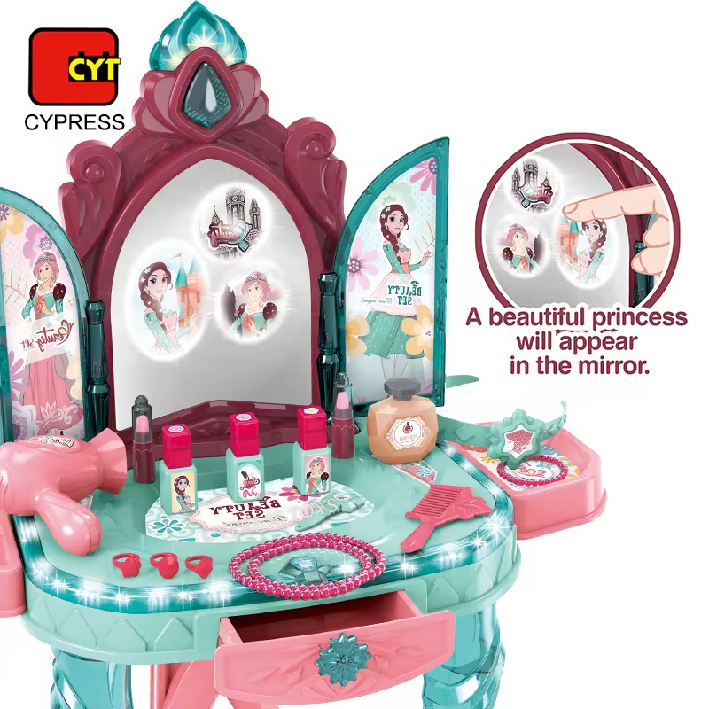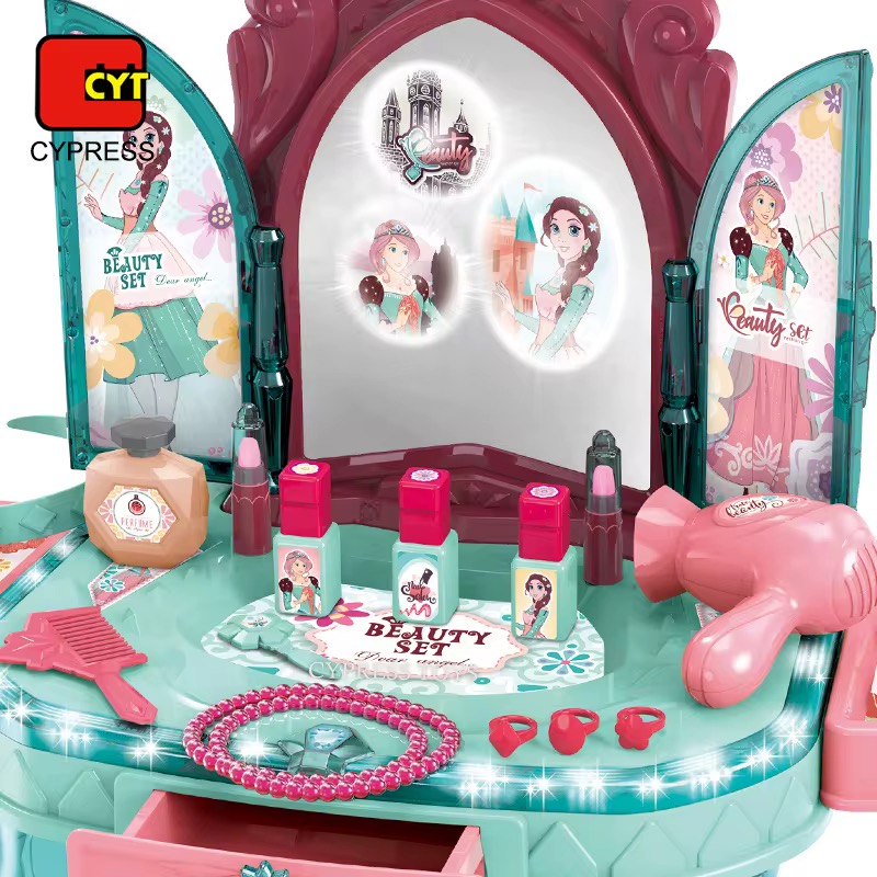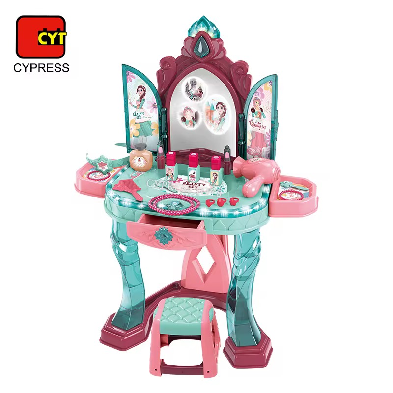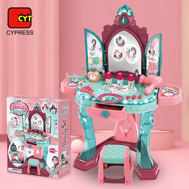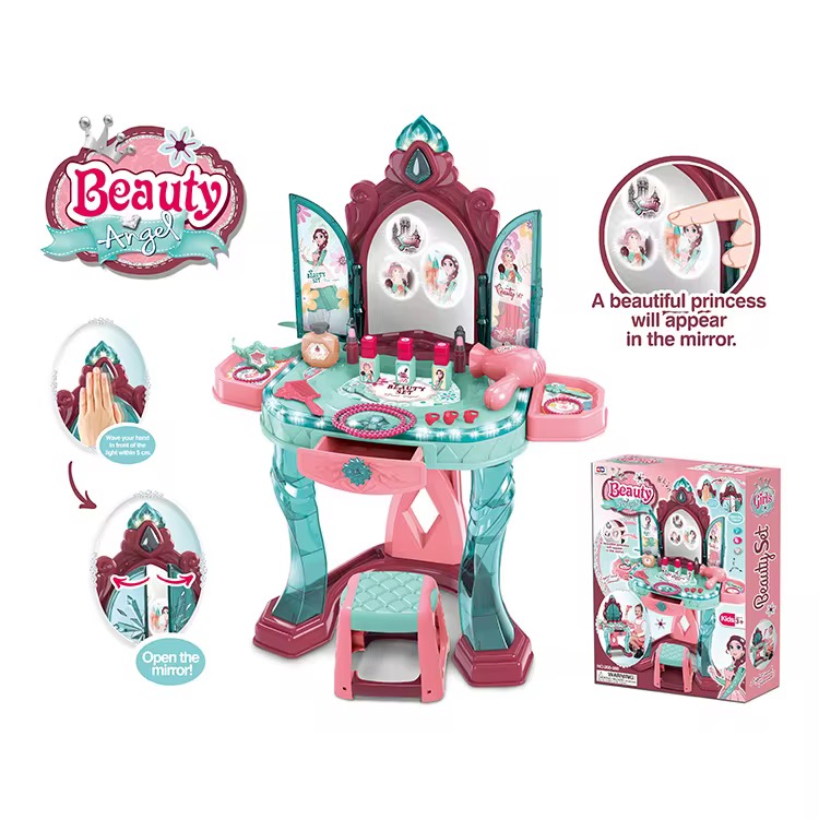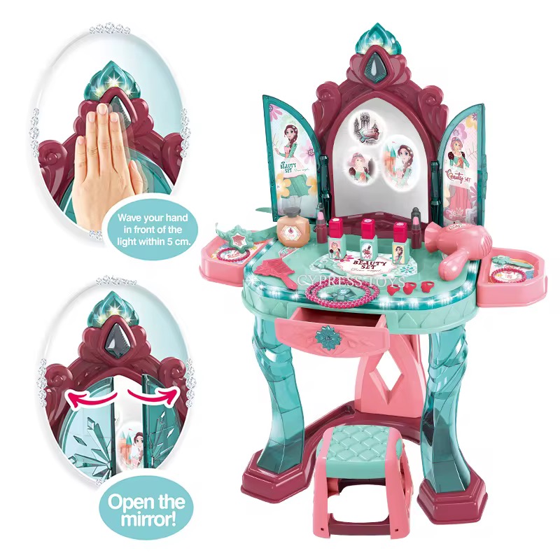تسريحة ملوّنة مع مرآة، مقعد مريح، وأدوات تجميل مثل المشط، المجفف، والعطور اللعبة.