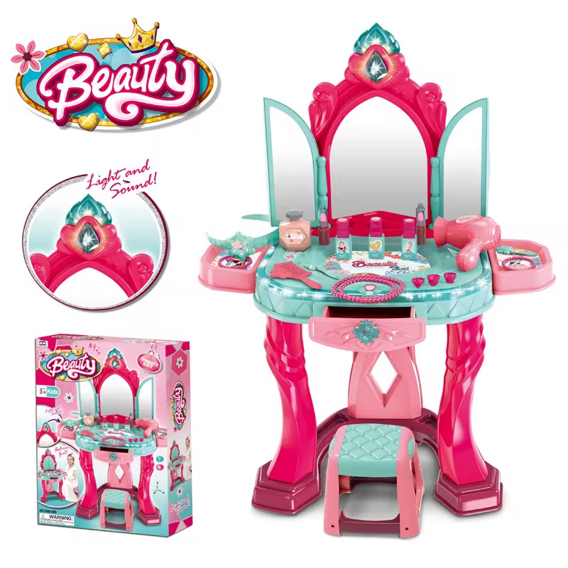 تسريحة ملوّنة مع مرآة، مقعد مريح، وأدوات تجميل مثل المشط، المجفف، والعطور اللعبة.
