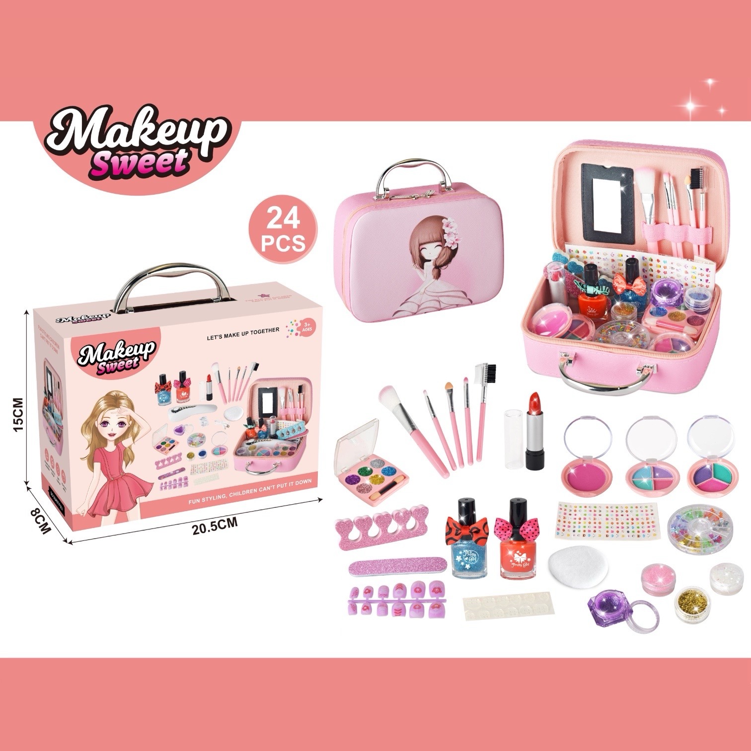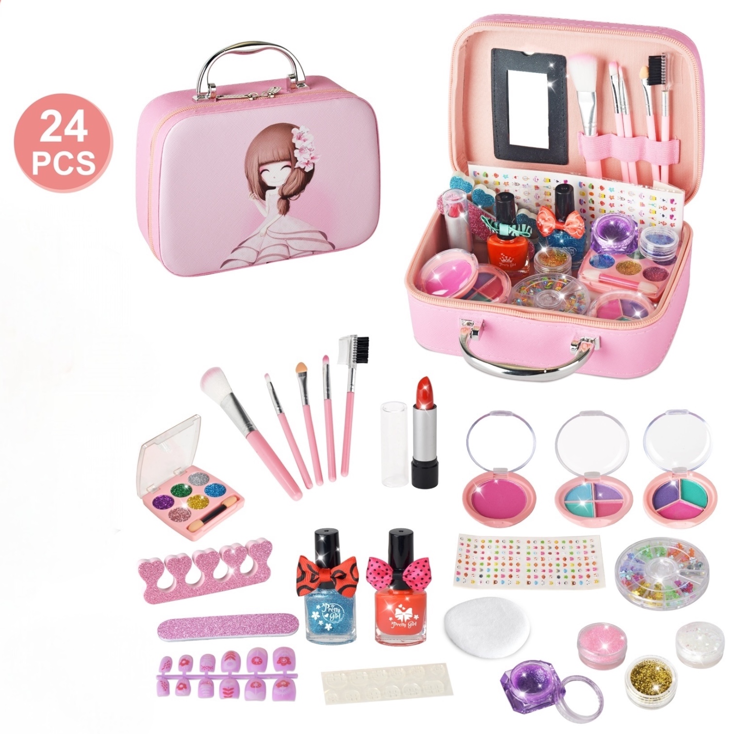 حقيبة مكياج للأطفال تحتوي على مكياج ، مناكير ملون، وأدوات تجميل صغيرة، لتمنح طفلتك تجربة لعب ممتعة وتقليد الكبار بأمان وإبداع