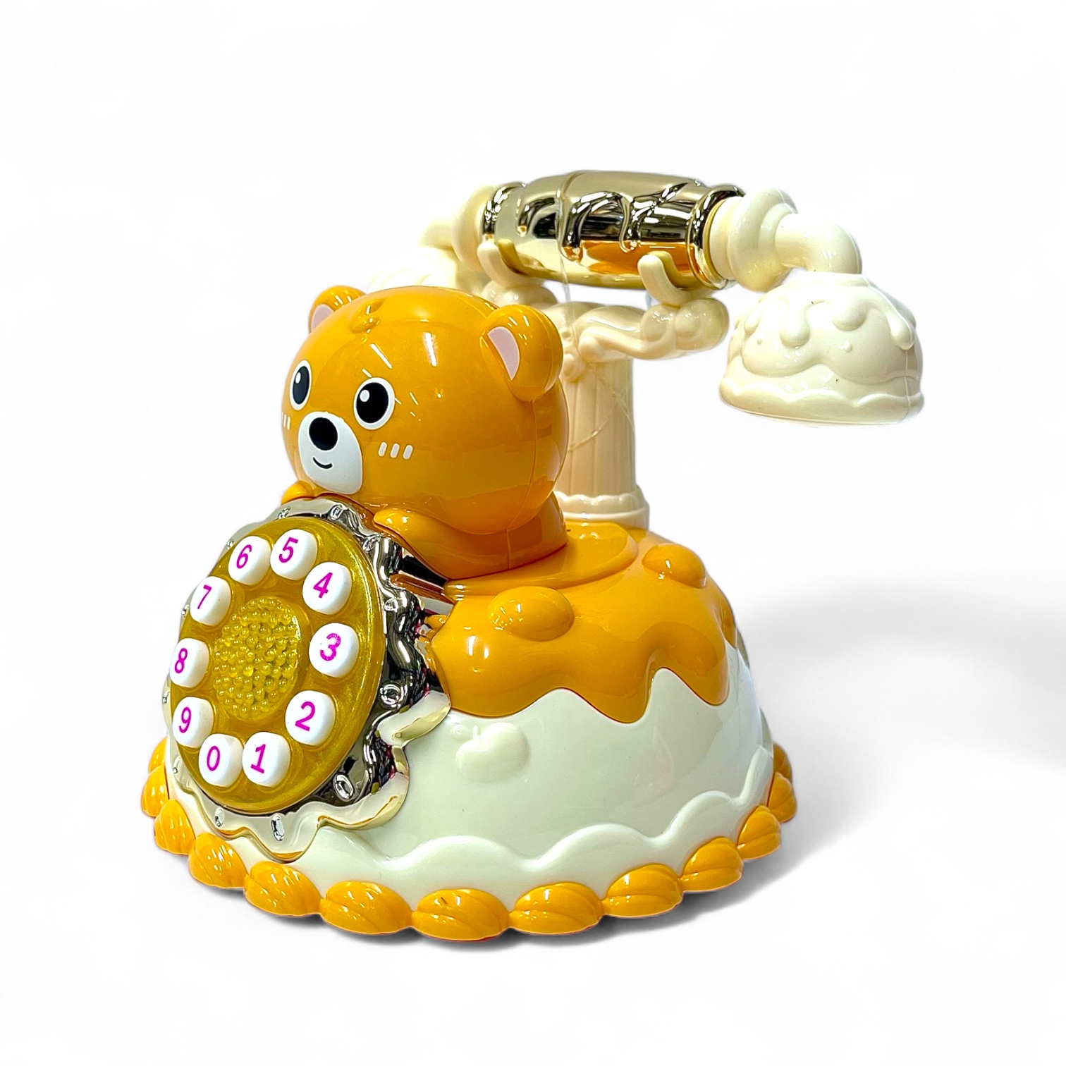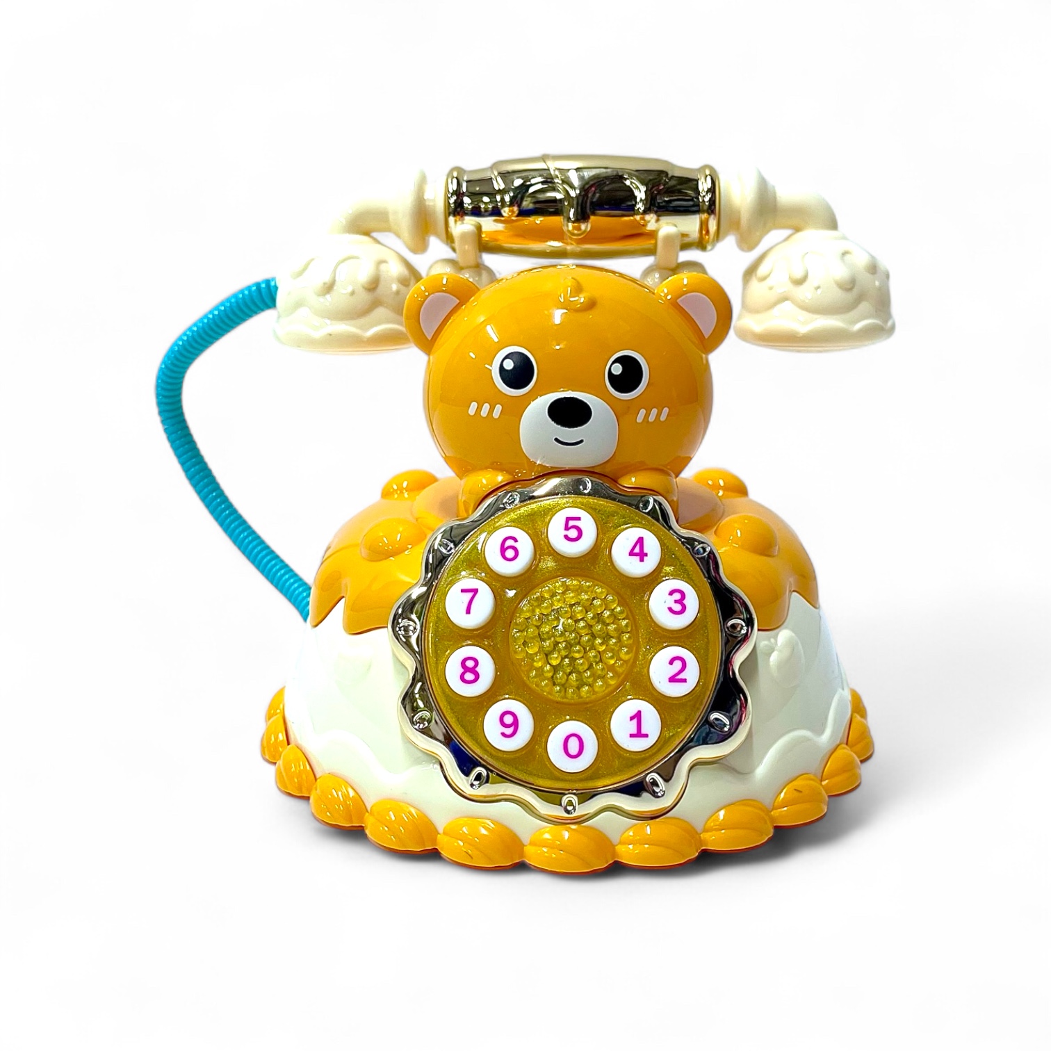 لعبة هاتف أطفال بتصميم كلاسيكي ومجسم دب هي لعبة مميزة تجمع بين شكل الهاتف التقليدي ذو السماعة الدوّارة أو الأزرار الكبيرة، وبين شكل دب كرتوني ظريف، مما يجعلها محبوبة لدى الأطفال وممتعة بصريًا وجذابة للتفاعل.